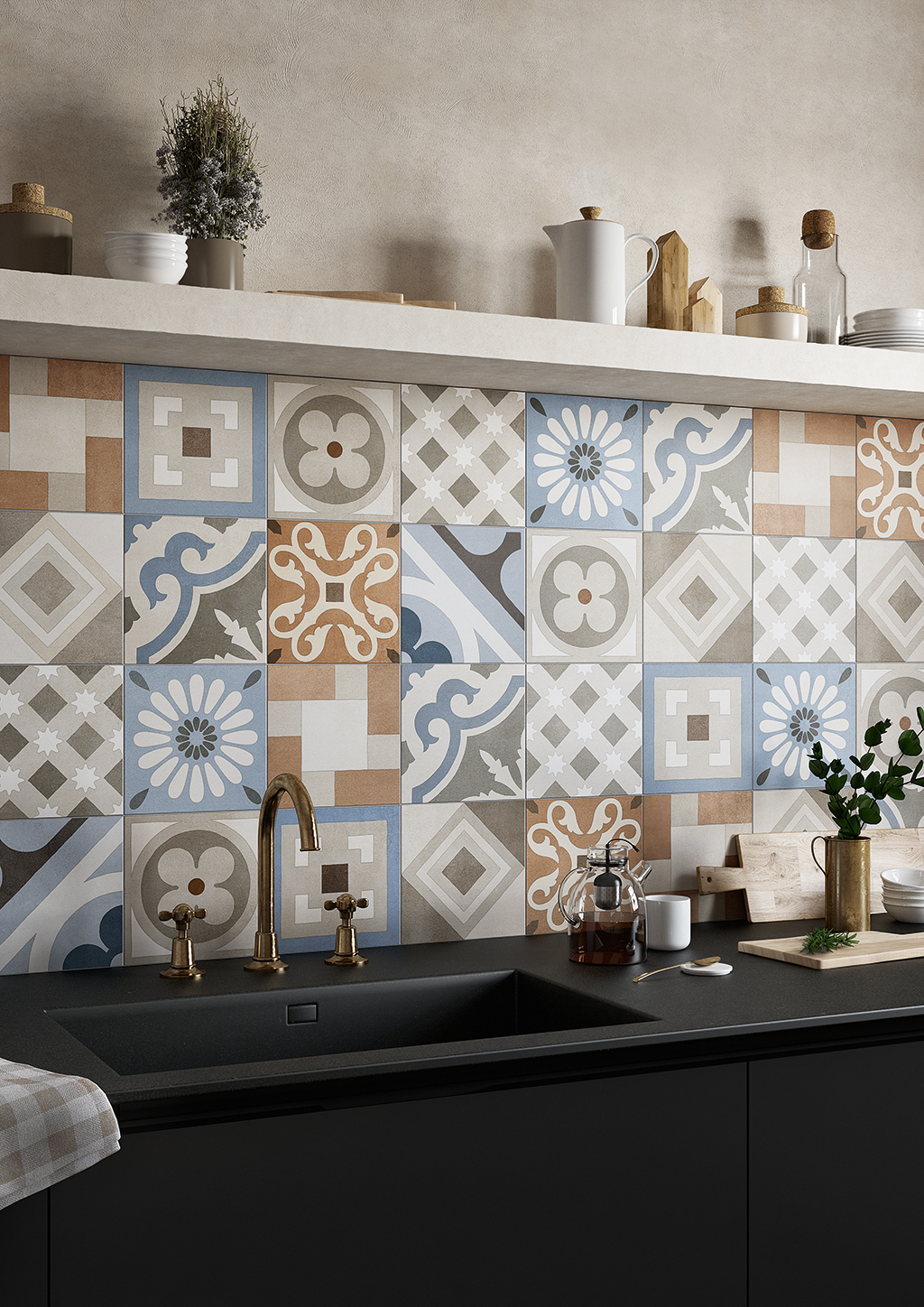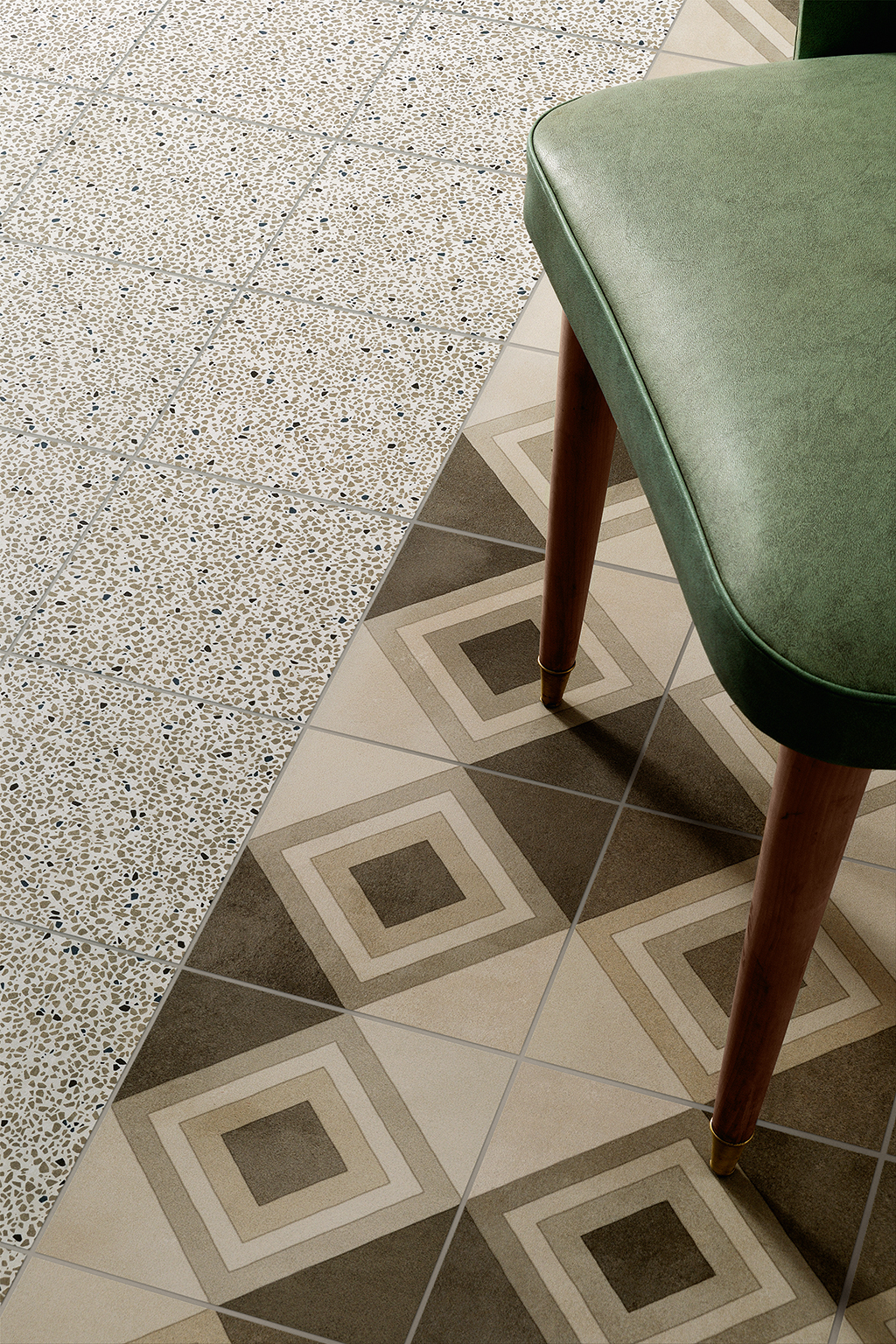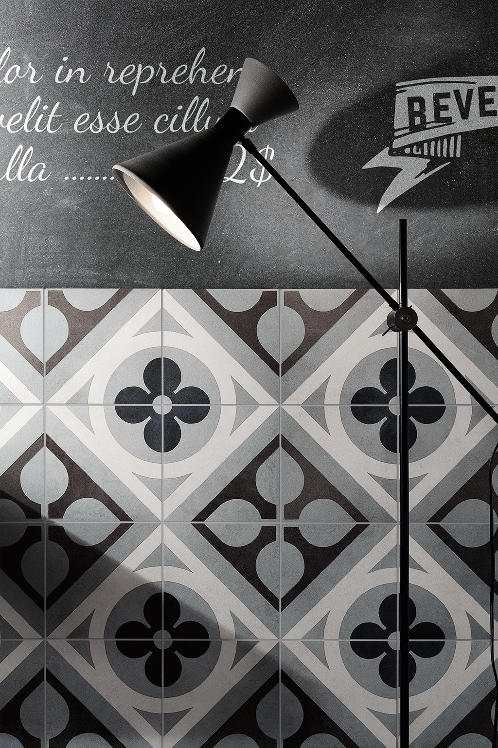 Diese Fliesen inspirieren sich an den traditionellen quadratischen oder sechseckigen Fliesen aus Zementmasse, die vorherrschenden Farben sind traditionell Grau und Ziegelrot. Zu Beginn des 20. Jahrhunderts waren Zementfliesen neben Terrazzofliesen äußerst beliebt: Sie galten als haltbar und preisgünstig, und daher wurden sie häufig für Küche und Bad, aber auch für Arbeitsbereiche verwendet. Dabei wurde die gestalterische Wirkung in vielen Fällen durch die einfache Kombination unterschiedlicher Farben erzielt. Aber gerade die Zementfliesen erlaubten auch raffiniertere Dekorlösungen, mit Blumenmustern, Friesen und Mäandern, die ganz dem damals beliebten Jugend- oder Art-Deko-Stil entsprachen. Häufig dienten sie als kühlere Alternative zum Teppich. Sie erlauben ebenso wie dieser die Räume ästhetisch zu unterteilen. Eine Neuentdeckung, die sich heute zu einem Trend entwickelt hat, der in Form von Keramikfliesen neue Akzente setzt und neue stilistische und farbliche Lösungen erlaubt.